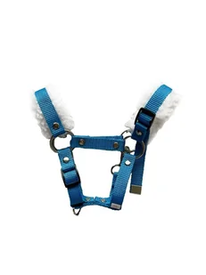 Regulowany kantar z futerkiem dla Hobby Horse z taśmy o szerokości 1,5 cm w kolorze niebieskim. Spinany napownicą. Napy,kółka i karabińczyk w kolorze srebrnym.