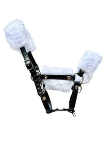Regulowany kantar z futerkiem dla Hobby Horse z ecoskórki o szerokości 1 cm w kolorze czarnym. Spinany napownicą. Napy,kółka i karabińczyk w kolorze srebrnym.
