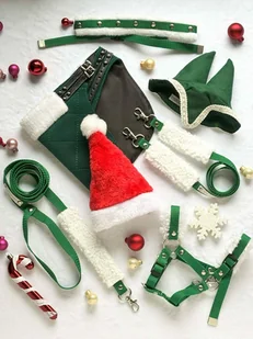 Zestaw Świąteczny dla Hobby Horse Nauszniki w kolorze zielonym z filcu, wykończone ozdobną lamówką. Eleganckie wodze z zielonej taśmy o szerokości 1,5cm wykończone białym futerkiem. Długość 90 cm. Spinane napownicą, zapięcie na karabińczyki. Zielona opaska świąteczna o szerokści 4 cm, regulowana minimalny obwód 40 cm max 73 Elegancka, regulowana derka z futerkiem dla Hobby Horse.