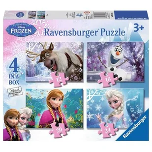Puzzle rysunkowe 4w1 Ravensburger zawierają motywy z ulubionymi bohaterami bajki Kraina Lodu. Charakteryzują je wyraźne kolory, różnorodność kształtów, idealne dopasowanie elementów.