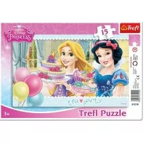 Pomysłowe puzzle dla młodszych dzieci z grafiką z Księżniczkami Disneya. Układanka zawiera 15 elementów umieszczonych w ozdobnej, spójnej graficznie ramce, tworzącej z obrazkiem bardzo ładną całość. Dodatkowo ramka ułatwia młodszym dzieciom ułożenie obrazka i pozwala na bezpieczne przenoszenie układanki, dzięki czemu swobodnie ozdobimy nią pokój. Wyraziste kolory i prosty wzór są idealnie dostosowane do wieku i umiejętności dziecka.