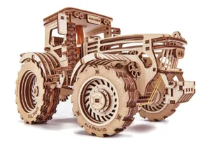 - drewnianych paneli ze sklejki, z naciętymi elementami, które należy wypchnąć przed montażem - obrazkowej,dokładnej instrukcji krok po kroku po wykonaniu model będzie się poruszał posiada otwierane drzwi po obu stronach po otwarciu drzwi można ze środka kabiny (jak w prawdziwym modelu) otworzyć pokrywę silnika z przodu u góry można nakręcić mechanizm, który po zwolnieniu blokady sprawi, że traktor ruszy do przodu gdy mechanizm jest nakręcony i otwarta pokrywa silnika można obserwować jak pracują tłoki w silniku maszyny materiał: