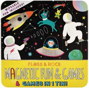 Pudełko zawiera gry: Meteoryty i drabiny Kółko i krzyżyk Scena magnetyczna Wyszukiwanie słów Ponadto kostki do gry, długopis z gumką i woreczek do przechowywania wszystkich elementów magnetycznych. Wymiary: 19. 5 x 19. 5 x 4 cm Zalecany wiek: 3+