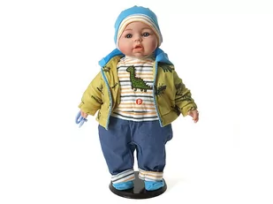 Przepiękna lalka bobas chłopiec z dźwiękiem to świetna zabawka dla dzieci, dostarczająca mnóstwo radości i wspaniałej zabawy. Laleczka odznacza się uroczą, niemowlęcą buzią. Ubrana jest w żółtą, ciepłą kurteczkę z kapturem, białą bluzeczkę w paski z dinozaurem, niebieskie spodnie, czapeczkę i skarpetki. Lalka posiada około 45cm wzrostu, co sprawia, że jest idealna do przytulania, dając dziecku poczucie bliskości. W opakowaniu znajdziemy również śliczny, niebieski smoczek przeznaczony dla lalki.