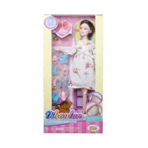 Lalka (typu Barbie) w ciąży. Brzuszek lalki można chować. W zestawie także akcesoria niemowlaka jak: gryzaczki, smoczek, butelka, miseczka. Produkt zapakowany w kartonowe opakowanie z przezroczystym okienkiem.