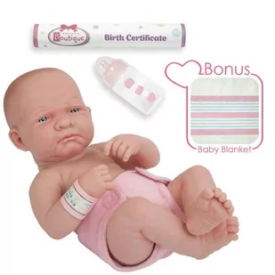 hiszpańska lalka, różowa pieluszka, akt urodzenia, szpitalna opaska, buteleczka do karmienia, różowy kocyk dla niemowląt.