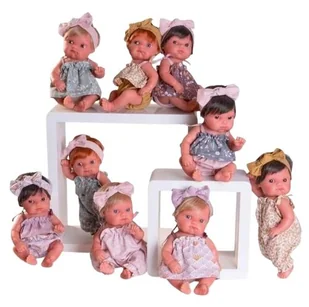 Zestaw Mufly 9 lalek 21cm Antonio Juan. Niewielkie, winylowe lalki hiszpańskie renomowanej marki Antonio Juan, umieszczone w elegancko wyglądającym biało-różowym standzie proponujemy szczególnie sklepom stacjonarnym, księgarniom i hurtowniom zabawek 21-centymetrowe bobaski o uroczych twarzyczkach. . .