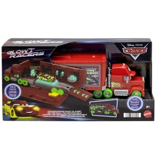 Rozpocznij niesamowitą zabawę dzięki elementom świecącym w ciemnościach! Z tym zestawem Auta Glow Racers, Maniek Świecący w ciemnościach możesz rozświetlać rajdowe przygody elementami świecącymi w ciemności i napędzać podwójną zabawę. Ta ciężarówka jest jednocześnie transporterem do popychania oraz rozkładanym zestawem do zabawy z centrum serwisowym. Otwórz naczepę Mańka i znajdź Guido, który jest gotowy sprawdzić opony pojazdów przed kolejnym wyścigiem. Możesz też zamknąć zestaw i popchnąć Mańka, aby ruszyć w drogę. Ciężarówka ma szczegółowe, dobrze znane fanom dekoracje inspirowane filmem, które świecą w ciemności.