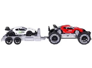 Zabawkowe auto terenowe z lawetą i sportowym samochodem to pojazd dla którego żadna przeszkoda nie będzie straszna. Autka oraz laweta wykonane zostały w całości z plastiku. Koła lawety i sportowego auta są gumowe zaś autka terenowego plastikowe. Terenowe autko porusza się poprzez rozpędzenie w przód, a sportowe dzięki zastosowanemu mechanizmu pull-back - pociągnij w tył i puść. Przyczepa pełni funkcję lawety na której transportowane jest sportowe autko, idealny na wyjazdy rajdowe.