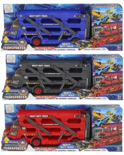Ciężarówka z naczepą do przewożenia pojazdów to obowiązkowa pozycja dla każdego małego kolekcjonera potężnych samochodów i innych środków transportu. Laweta posiada 3 poziomy przeznaczone na bezpieczne przewożenie i przechowywanie samochodzików, dzięki temu pociecha nie zgubi ani jednego cennego autka oraz będzie mogła transportować je po torach wyścigowych na całym świecie. Tir posiada również wyrzutnię samochodzików, wystarczy rozłożyć tylną część tira i gotowe! Aby wystrzelić autko trzeba naciągnąć wystający element toru, położyć przed nim samochodzik, nacisnąć przycisk znajdujący się na końcu toru, w kształcie litery "U" i patrzeć jak samochodzik mknie! Tor prowadzi przez najniższy poziom lawety i wychodzi na miejscu maskownicy u tira. Jest to idealny mechanizm pozwalający zdobyć przewagę w szalonym wyścigu. Naczepa z trzema poziomami przeznaczonymi na miejsca transportowe dla samochodzików ma możliwość podniesienia się, tak, aby bez problemu móc umieścić tam autka. Dodatkowo do zestawu dołączono plan miasta, który może odpowiadać za tor wyścigowy, kolorowe samochodziki oraz znaki drogowe.