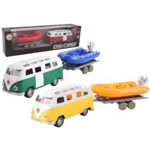 Czas ruszyć w podróż pełną przygód! Zestaw ?Bus z przyczepą i pontonem? od marki Pro Kids to hołd dla klasyki motoryzacji i wypoczynku w stylu retro. Kultowy, dwukolorowy van inspirowany legendarnym Volkswagenem T1 zachwyca swoim charakterystycznym wyglądem, detalami wykończenia i otwieranymi drzwiami. W zestawie znajduje się także dwukołowa przyczepa oraz kolorowy ponton z silnikiem zaburtowym ? gotowy do wodnych ekspedycji. Dzięki solidnemu wykonaniu z metalu i tworzyw sztucznych, model jest odporny na intensywną zabawę. Funkcja pull-back dodaje dynamiki, a różnorodność kolorystyczna pozwala wybrać ulubioną wersję.