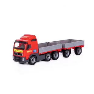 Zabawki z serii Volvo firmy Polesie wyglądają jak prawdziwe ciężarówki. Samochód z burtami i przyczepą Volvo to duża ciężarówka wyposażona w szerokie koła połączone metalowymi osiami. Koła mają bieżnik, co ułatwia jazdę po nierównych powierzchniach. Skrzynia ładunkowa oraz dołączona przyczepa wyposażone są w otwierane burty. Te miniatury popularnych pojazdów budowlanych są wykonane z najwyższej jakości materiałów.