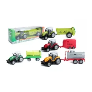 Plastikowy traktor z przyczepą. Pojazd świeci światełkiem oraz wydaje dźwięki: zapalania silnika. Zabawka działa na baterie typu AG13. Baterie znajdują się w zabawce. Zabawka dla dzieci od 3 lat. MIX - wysyłka losowa.