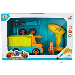 Wywrotka do skręcania z wiertarką. W zestawie również klucz do montowania kół oraz kierowca. Przednia szyba auta podnoszona, dzięki czemu można wyjąć kierowcę. Samochód z dźwiękami, wymaga baterii - 2xAAA (niedołączone). Wiertarka wymaga baterii - 2xAA (niedołączone).