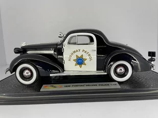 Nazwa: Pontiac DeLuxe Police Car 1936 Black White Producent: Signature Numer id: 18140-1 Skala: 1/18 Opis: Model wykonany z metalu, w modelu mamy otwierane dwoje drzwi maske silnika, bagaznik oraz skrętne koła,
