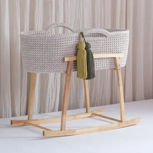 Kosz Mojżesza (CAFFE LATTE) z materacem + 2 dekoracyjne frędzle + Bujak drewniany naturalny olejowany