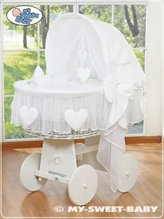 Piękny ręcznie pleciony wiklinowy kosz z oryginalnym dużym drewnianym podwoziem. Biały kolor wikliny i drewna. W komplecie obszycie i pościel w kolorze białym z lamówką, szyfonem i wiszącymi serduszkami.