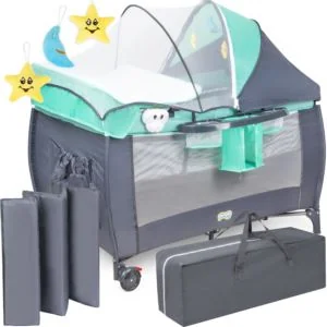 Jest to wielofunkcyjny mebel, który pełni rolę nie tylko wygodnego łóżka ale również kojca do zabawy czy miejscem do przewijania. Lekka, składana konstrukcja oraz torba transportowa z uchwytem, ułatwią przenoszenie łóżeczka.
