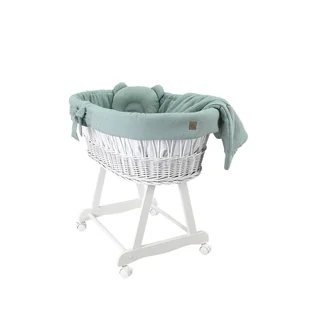 Wiklinowy kosz Mojżesza AMELIA biały z pościelą muślinową GOLD khaki.