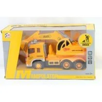 Auto ciężarówka budowlana z koparką na pilot, który porusza się w różnych kierunkach. Samochód posiada lekkie, regulowane ustawienie kół przednich oraz światła. Łopatą koparki można ruszać. Cały zestaw wykonany jest w ciekawej grafice. Auto wymaga baterii 3.