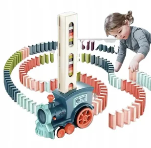 Interaktywny Pociąg, Kolejka układająca Domino dla Dzieci - Niebieska Zabawka interaktywna, która porusza się, gra, świeci i układa za sobą kolorowe klocuszk...