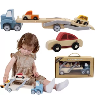 DREWNIANA LAWETA Drewniana laweta to zabawka dla dzieci składająca się z drewnianej lawety oraz przyczepy z rampą i trzema samochodzikami. Laweta jest wykonana z naturalnych materiałów, dzięki czemu jest bezpieczna i trwała. Dzieci mogą bawić się nią w domu lub na zewnątrz, ciągnąc ją za sobą lub przewożąc na niej swoje ulubione zabawki. Zabawa z drewnianą lawetą rozwija wyobraźnię oraz zdolności manualne i motoryczne dziecka. To także doskonała okazja do nauki różnych umiejętności, takich jak liczenie, rozpoznawanie kolorów i kształtów.