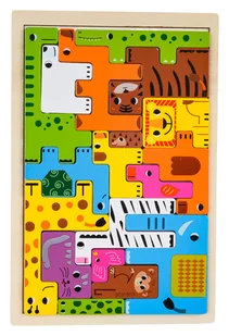 22,5 cm x 15 cm x 0,5, - wielkość największego klocka ok. 9,5 cm x 6 cm x 0,5 cm, - wielkość najmniejszego klocka ok. 2,5 cm x 1 cm x 0,5 cm, - opakowanie ok. 22,5 cm x 15 cm x 0,5 cm. Zawartość zestawu - 18 drewnianych puzzli (żyrafa, krokodyl, tygrys, lew, słoń, zebra, małpa, wielbłąd, wąż i inne), - podstawa do układania puzzli, - instrukcja.