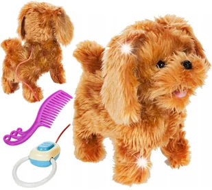zdalnie sterowany poprzez smycz chodzi do przodu i do tyłu po okręgu porusza pyszczkiem i główką gdy szczeka merda ogonkiem miły i przyjemny w dotyku w zestawie grzebień dla pieska zapakowany w kolorowy kartonik Parametry techniczne: wiek dziecka: 3+ wymiary: wys. 23 x szer. 12,5 x gł. 24cm grzebyk: dł. 8cm długość kabla: