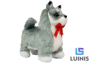 Piesek ma sierść w kolorze szarym, z elementami białego na łapkach, pyszczku i torsie, kolor oczu niebieski przyciąga wzrok. Odwzorowuje prawdziwego pieska tej rasy. Dodatkowo piękna czerwona kokarda na szyi dodaje mu uroku.