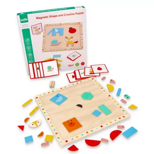 Duża magnetyczna plansza o wymiarach 30 x 30 cm, pozwoli na ułożenie naprawdę ciekawych i oryginalnych wzorów. W zestawie znajduje się magnetyczna podstawa, 26 magnetycznych kształtów w barwnych kolorach oraz 15 kart wzorów. Taka ilość elementów pozwala na tworzenie niemal nieograniczonej ilości obrazków. Dla wygody w zestawie znajduje się także drewniany klocek z wycięciem, w który można włożyć kartę wzorów tak by było nam wygodniej obserwować i układać dany wzór. Mimo dużych rozmiarów tablicy, opakowanie jest płaskie dlatego z łatwością zabierzecie ten produkt w podróż czy na wakacje.