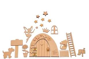 Kolor: naturalny - małe drzwi z 2 zawiasami z grawerowanymi detalami + uchwyt - sklejka 6 mm - wys. 130 mm, szer. 150 mm - wróżka, kotek, piesek, tabliczka n...