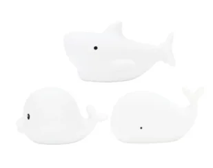 Zestaw lampek Mini Wodne to trzy świecące wodne zwierzątka, wprost idealne dla małych rączek. Lampki są wodoodporne i unoszą się na wodzie, dzięki czemu mogą towarzyszyć dziecku podczas kąpieli. W skład zestawu MINI MORSKIE Rabbit & Friends wchodzą trzy mini lampki: Rekin, Delfin i Wieloryb. Mają charakterystyczne i urokliwe kształty. W kolorze białym z czarnymi oczkami. Są lekkie i wygodne do chwytania przez małe rączki. Lampki zapewniają kojące towarzystwo w trakcie wieczornych zabaw i ułatwiają proces zasypiania. Nieco starszych dzieciom posłużą jako przenośne oświetlenie w drodze przez ciemny korytarz do łazienki lub sypialni rodziców. Paleta kolorów lampek tworzy niepowtarzalny, harmonijny, wypełniony miękkim światłem klimat. Lampki działają na poklepywanie. Po włączeniu świecą biały, ciepłym światłem. Klepniecie silikonowej powierzchni powoduje zmianę kolorów. Pozostawione bez aktywności wyłączają się automatycznie po 60 sekundach. Obsługa lampek jest intuicyjna - nawet małe dziecko poradzi sobie bez problemu. Klasa szczelności IP 67 umożliwia zanurzenie lampek w wodzie na głębokość do 1 m, ale nie dłużej niż na pół godziny. Warunkiem korzystania z lampek w wodzie jest prawidłowe zamknięcie dolnej pokrywy. Lampki Mini Wodne nie mają ostrych krawędzi ani się nie nagrzewają (dzięki technologii LED). Zasilane są poprzez baterie: CR 2025. Każda lampka ma baterię. Do zestawu dołączone są zapasowe baterie w ilości 6 sztuk. Lampki wykonane są z wysokiej jakości, certyfikowanego, bezpiecznego, wolnego od BPA, silikonu. Cechy:
