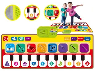 MATA MUZYCZNA - PIANINO Mata Muzyczna Pianino to niezwykła zabawka, która umożliwia dzieciom granie poprzez naciskanie klawiszy pianina na macie. Idealna zabawka dla dzieci, które uwielbiają muzykę. Zabawka składa się z kolorowej maty pianina oraz urządzenia dźwiękowego. Na urządzeniu dźwiękowym znajduje się włącznik On/Off. Na macie znajdują się klawisze pianina, klawisze trybu działania (tryb demo, tryb zabawy, tryb nagrywania, tryb odtwarzania), regulator głośności, 8 instrumentów do wyboru (fortepian, skrzypce, akordeon, saksofon, ksylofon, klarnet, gitara, flet) Mata Muzyczna Pianino odgrywa 8 różnych, gotowych melodii oraz pozwala dziecku nagrywać własne kompozycje.