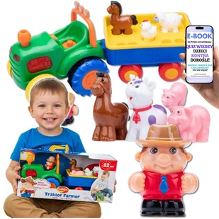ZAWARTOŚĆ ZESTAWU ✔️ Interaktywny traktor z przyczepą ✔️ 5 zwierzątek (świnka, krowa, koń, owca, kura) ✔️ Farmer – kierowca traktora ✔️ Efekty świetlne, muzyczne i dźwiękowe +