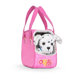 do 30 stopni. Rozwijane zdolności: kreatywność i wyobraźnia, koordynację ręka oko. W zestawie znajduje się: pluszowy szczeniak rasy Dalmatyńczyk, elegancka torebka do noszenia pieska z logo OG, smycz i obroża, miska z wodą i miska z karmą, 3 psie przysmaki w kształcie kostek, piłeczka, szczoteczka do zębów.