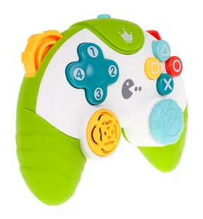 Zabawkowy pad - kontroler dla najmłodszych od 18-go miesiąca życia. Zabawkę wykonano w żywej kolorystyce przyciągającej wzrok dziecka, a wesołe dźwięki zachęcają do zabawy. Na górze pada znajduje się kółko i półksiężyc służące do obracania i wydające przy tym odgłosy klikania. Na przodzie kontrolera po lewej stronie umiejscowiono numerki od 1 do 4, które po naciśnięciu przez dziecko wydają zabawne dźwięki. W dolnej lewej części umiejscowiono żółty przycisk z głośnikiem. Po prawej stronie kontrolera mamy przyciski z kółkiem, krzyżykiem, kwadratem i trójkątem które po naciśnięciu grają różne melodie. Na dole pada po prawej stronie znajduje się niebieski przycisk, z piorunem który wydaje odgłos instrumentów. Efektom dźwiękowym w zabawce towarzyszą efekty świetlne. Po naciśnięciu na którykolwiek z przycisków podświetla się rysunek umiejscowiony na środku zabawki. Zabawka zasilana jest bateriami typu 2 x AAA 1,5V, baterie dołączono do zestawu.