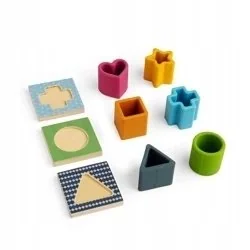 Zabawka edukacyjna polegająca na dopasowaniu kształtów. Połóż drewniane płytki na płaskiej powierzchni, otwórz torebkę ze ściągaczem i przeszukaj wnętrze, ab...