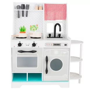 Drewniana kuchnia dla dzieci TinyTreats z pralką: Drewniana kuchnia dla dzieci to niezwykle uroczy i klasyczny zestaw zabawek, który zapewni maluchom godziny kreatywnej zabawy i rozwinie ich umiejętności. Zestaw został wykonany z wytrzymałego i ekologicznego drewna, co sprawia, że jest bezpieczny dla dzieci i trwały w użytkowaniu. Solidna konstrukcja pozwala na stabilne ustawienie kuchni, co jest niezwykle istotne, gdy maluchy bawią się energicznie. Biała kuchnia dla dzieci TinyTreat: