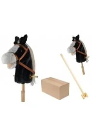 Koń z dźwiękiem drewniany kij składany z kółkami, kolor czarny, głowa konia w środku styropian, bez rączek,pakowanie indywidualne karton b/o baterie nie załączone 2 x AA