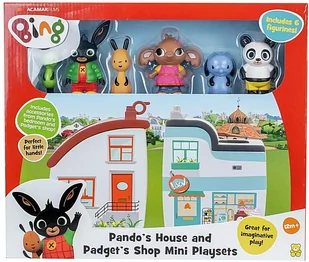 DOMEK SKLEP BING + FIGURKI Domek i figurki są idealnie dopasowane do małych rączek, a wiele jaskrawych kolorów pobudza wyobraźnię do zabawy. Zbuduj świat Binga za pomocą tego kolorowego zestawu. W zestawie dom Binga, dom Pandos i zestaw figurek. Dom Pando można otworzyć: znajdź figurkę Pando w jego żółtych szortach, łóżko Pando i komodę.