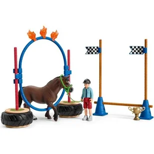 Rozpoczynamykolejny etap tresury kucyków! Jeśli skończyły szkolenie, mogą teraz wziąćudział w wyścigu agility. Właśnie czekają na start przejęte i pełneniepewności. Czy sprostają zadaniom$302 Jak będzie przebiegał konkurs$303 Czypoddadzą się czy też pewnie pokonają przeszkody$304 Zwinność jest tu tak samoważna jak jazda! Przeszkodymożna łączyć i projektować według własnego uznania. Zestawodpowiedni dla małych i dużych koni Schleich. Figurkadziecka posiada ruchome nogi.