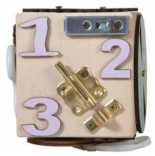 Wyposażenie: • różnokolorowe, ruchome kółka zębate • dwa rodzaje zasuwek • kolorowe cyferki drewniane • but ze sznurówką (nauka sznurowania) • drewniana pszczółka i kwiatuszek • ruchome kółko z cyframi • spinner • nietłukące lusterko umieszczone w kolorowym słoneczku Wymiary: wymiar kostki: 10 x 10 x 10, wymiar kostki z elementami: 12,5 x 11,5 x 12,5