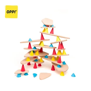 Zestaw konstrukcyjny Piks Big francuskiej marki OPPI to innowacyjna wielofunkcyjna zabawka, przeznaczona do rozwijania koncentracji, zdolności motorycznych i kreatywności u dzieci. W skład zestawu wchodzi: 48 silikonowych stożków w trzech kolorach i wysokościach (16 niskich niebieskich, 16 średnich żółtych i 16 wysokich czerwonych), 16 deseczek z litego drewna bukowego, o nieregularnych kształtach i różnej wielkości, broszura z instrukcjami do proponowanych wersji zabaw i kartami kreatywnymi oraz bawełniany woreczek do przechowywania. Oryginalne połączenie elementów drewnianych i silikonowych zapewnia przyczepność, która pozwala graczom na zupełnie nowe podejście do zabawy i swobodne eksperymentowanie. Zadaniem silikonowych klocków jest bowiem stabilne podtrzymywanie drewnianych elementów, nie tylko w poziomie, ale także po skosie.