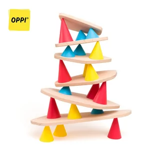 Zestaw konstrukcyjny Piks Small francuskiej marki OPPI to innowacyjna wielofunkcyjna zabawka, przeznaczona do rozwijania koncentracji, zdolności motorycznych i kreatywności u dzieci. W skład zestawu wchodzi: 18 silikonowych stożków w trzech kolorach i wysokościach (6 niskich niebieskich, 6 średnich żółtych i 6 wysokich czerwonych), 6 deseczek z litego drewna bukowego, o nieregularnych kształtach i różnej wielkości, broszura z instrukcjami do proponowanych wersji zabaw i kartami kreatywnymi oraz bawełniany woreczek do przechowywania. Oryginalne połączenie elementów drewnianych i silikonowych zapewnia przyczepność, która pozwala graczom na zupełnie nowe podejście do zabawy i swobodne eksperymentowanie. Zadaniem silikonowych klocków jest bowiem stabilne podtrzymywanie drewnianych elementów, nie tylko w poziomie, ale także po skosie.