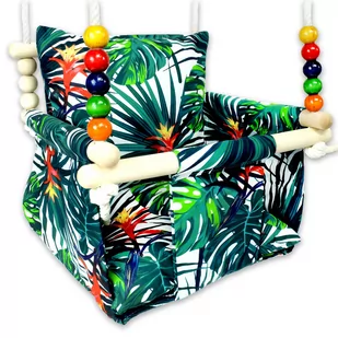 Huśtawka - "Zielone Palmy" Wyjątkowa, bezpieczna i wygodna huśtawka dla Twojego Malucha. Huśtawka wykonana jest z mocnych drewnianych drążków, podwójnej warstwy wysokiej jakości bawełny oraz wytrzymałych linek bawełnianych. Siedzisko jest dodatkowo usztywnione. W skład zestawu wchodzą również dwie poduchy. Jest to znakomite połączenie bezpieczeństwa, jakości i komfortu.