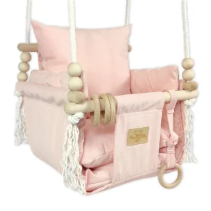 Radość, zabawa i bezpieczeństwo w jednym Idealna do zawieszenia w domu, na tarasie lub w ogrodzie Wyposażona w dwie miękkie poduszki prostokątne i jedną podłużną dla większego komfortu Dodatkowe drewniane elementy – gryzaki i kuleczki – wspierają rozwój sensoryczny dziecka Regulowane bawełniane liny pozwalają dostosować wysokość huśtawki Dedykowana dzieciom od 6. miesiąca życia, maksymalne obciążenie: 20 kg Solidne mocowanie za pomocą dwóch metalowych obręczy Naturalne materiały – gwarancja jakości i komfortu Konstrukcja wykonana z naturalnego drewna o gęstości do 550 kg/m³ i wysokiej wytrzymałości na zginanie do 100 MPa. Poduszki wykonane z miękkiej, gęstej i aksamitnej tkaniny obiciowej typu velvet posiadającej bardzo dobrą odporność na ścieranie (do 100 000 cykli - test Martindale). Wypełnienie z oddychającej kulki silikonowej – hipoalergiczne, nieodkształcające się, zapewniające długotrwały komfort Bawełniane liny o dużej wytrzymałości, odporne na przetarcia i łatwe do regulacji Wszystkie wykorzystane materiały posiadają certyfikaty OEKOTEX 100 klasa I oraz CE, co potwierdza ich pełne bezpieczeństwo dla dzieci Wymiary: