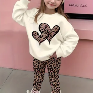 TEMU Dwuczęściowy zestaw dla dziewczynek składający się z bluzy z okrągłym dekoltem w kształcie i spodni w panterkę, idealny na jesienne i zimowe