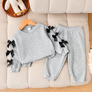 TEMU Dziewczęcy Zestaw Długich Spodni i Uroczy Casualowy Strój z Jasnoszarym Bluźnikiem z Kapturem i Czarną Kokardą na Rękawach oraz Pasującymi