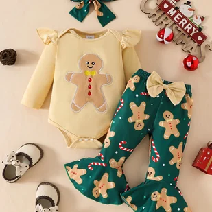 TEMU Trzyczęściowy zestaw: świąteczny, kreskówkowy, haftowany kombinezon z długim rękawem i lotnymi rękawami oraz spodnie typu "bell-bottom" z