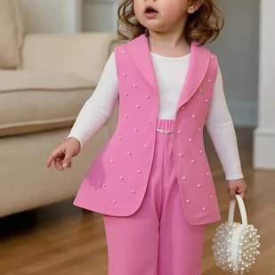 TEMU Zestaw Trzech Stylowych Białych Koszulek z Długim Rękawem i Okrągłym Dekoltem + Różowa Kamizelka z Perłowymi Ozdobami + Szerokie Spodnie z